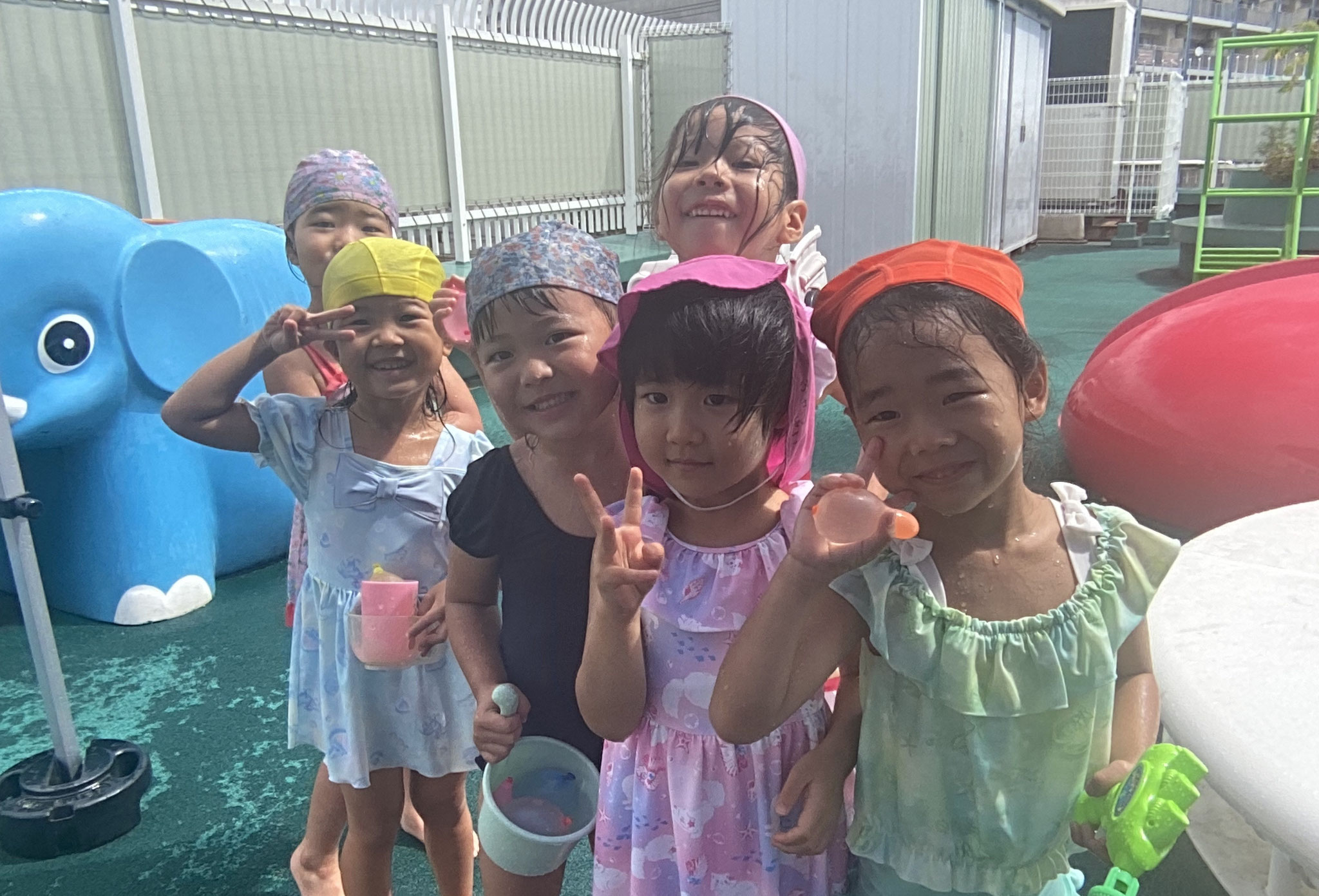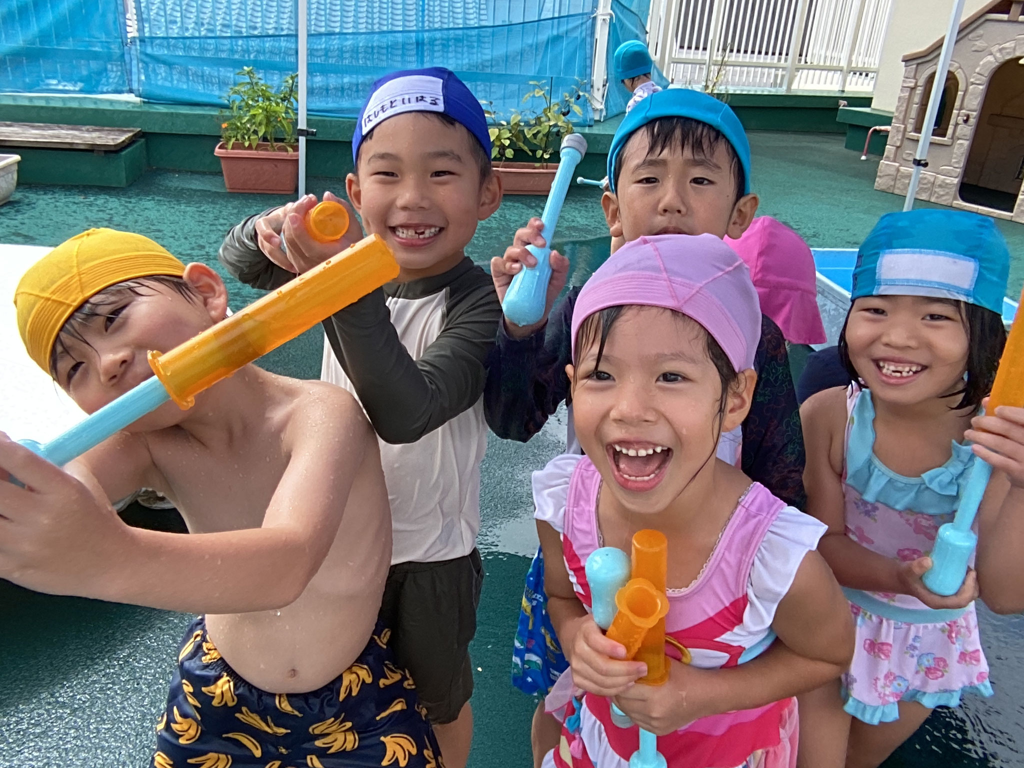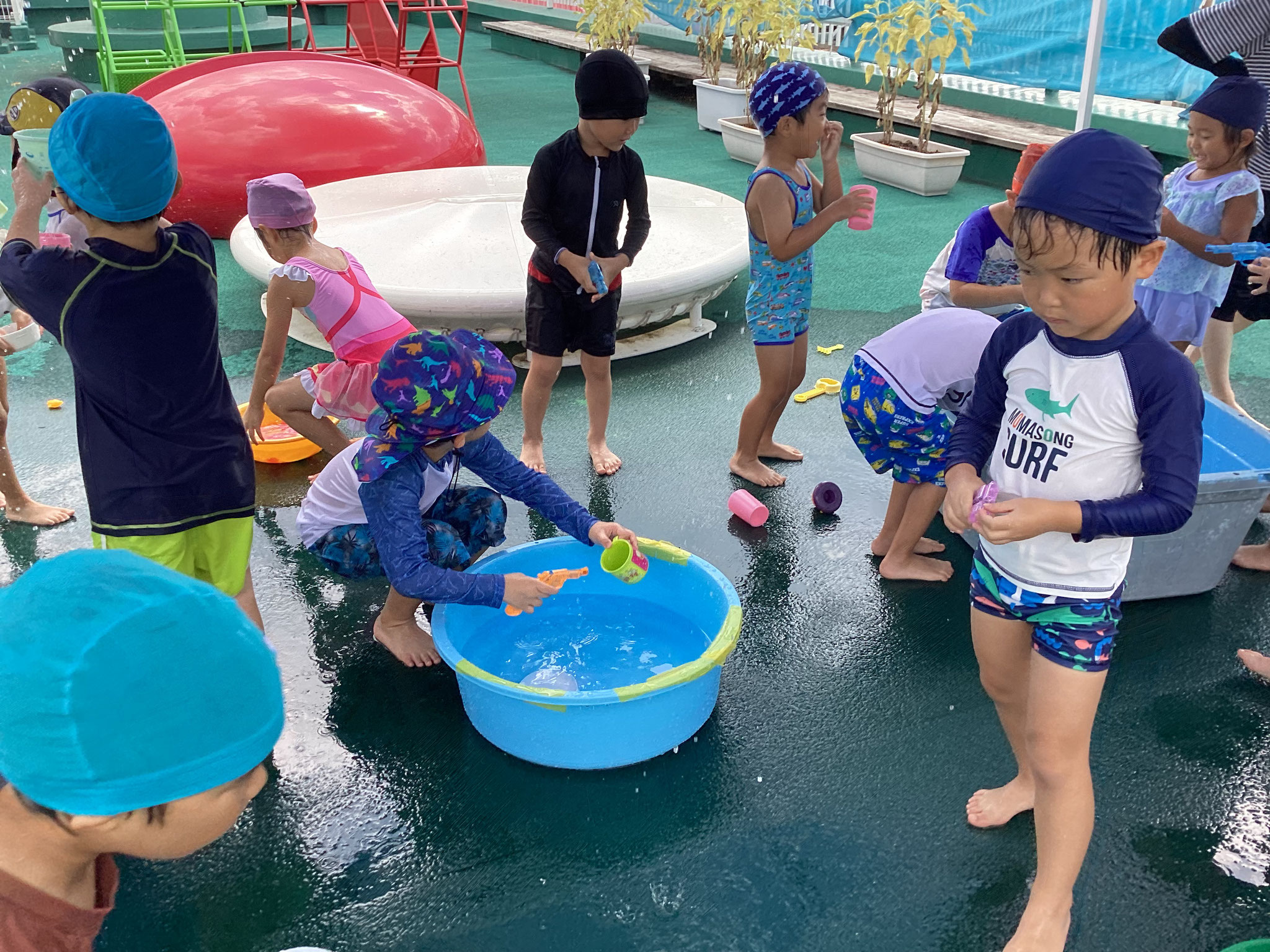 一緒に水遊び、集団遊び、運動遊びを行ったり